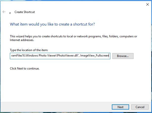 转到桌面并右键单击空白区域。从打开的窗口窗格中,选择“新建”,然后单击“快捷方式”。这将打开“创建快捷方式”窗口。在“创建快捷方式”窗口的文本框中键入以下快捷方式:rundll32“%ProgramFiles%\ Windows照片查看器 \ PhotoViewer.dll”,ImageView_Fullscreen。