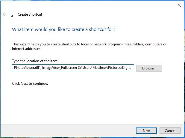 为图像选择目标文件夹后,在文件目标文件夹之前输入rundll32“%ProgramFiles%\ Windows照片查看器 \ PhotoViewer.dll”,ImageView_Fullscreen。您的位置应该是这样的:rundll32“%ProgramFiles%\ Windows照片查看器 \ PhotoViewer.dll”,ImageView_Fullscreen C:\ Users \ Matthew \ Pictures \ Digital。