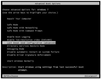 其次,用户可能已经更改了系统中的某些修改或配置。这样之后,由于系统配置不匹配,计算机就会出现蓝屏错误0x0000007b。用户可以按F8按钮,然后选择“上次已知的正确配置”。如果观察到Windows蓝屏0x0000007b已被纠正,则不会显示错误消息。相反,如果再次收到错误消息,则问题不在于系统更改的配置,而是完全取决于系统故障。