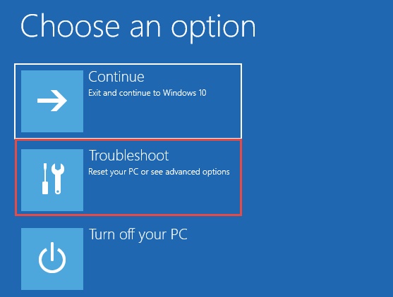 3. 这将启动重新启动选项。单击“疑难解答”部分继续。