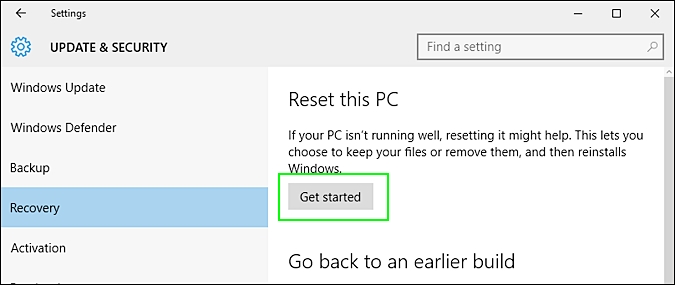 1. 这将在右侧提供恢复操作列表,单击“重置此PC”部分下的“开始使用”按钮。