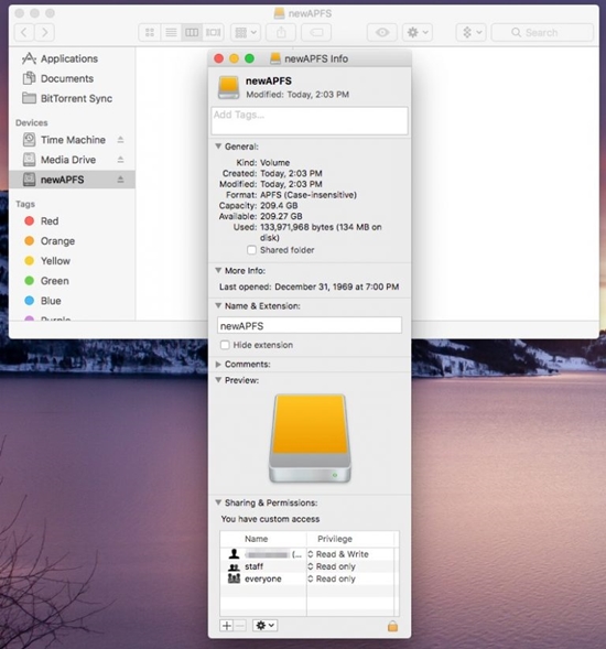 - 现在可以转到新的APFS驱动器,并查看其更改的属性。