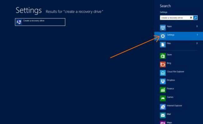 步骤2:转到“开始”屏幕,然后键入“创建恢复驱动器”。将搜索过滤器更改为“设置”,然后选择“创建恢复驱动器”以启动“恢复驱动器向导”。如果用户帐户控制提示权限,则单击"是"按钮。