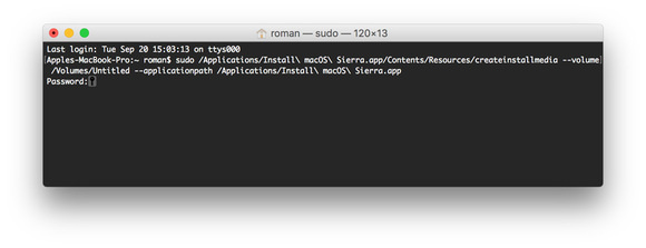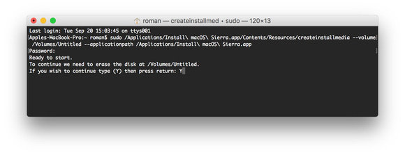 sudo / Applications / Install \ macOS \ Sierra.app/Contents/Resources/createinstallmedia --volume / Volumes / Untitled --applicationpath / Applications / Install \ macOS \ Sierra.app