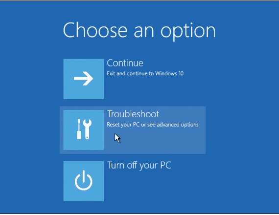 - 选择“疑难解答”选项以修复Windows 10无法启动。