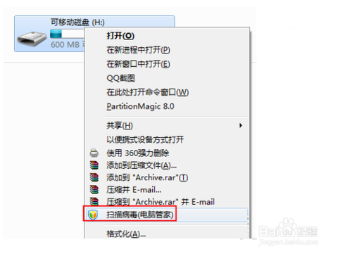 如果通过以上的方法还是不能完成U盘的格式化操作,我们可以对U盘进行病毒查杀操作。首先,在U盘盘符上右击,选择自己常用的杀毒软件进行查杀。完成后试着再次进行U盘格式化操作。