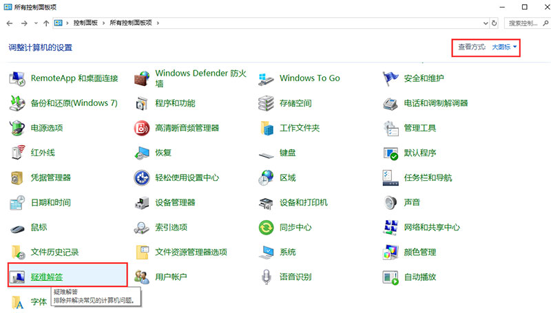 - 选择“大视图”图标后,单击“故障排除”。