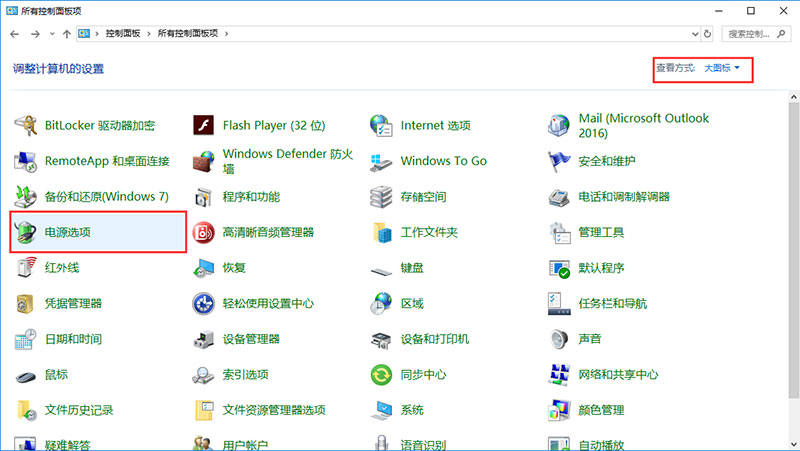 - 选择“按大图查看”图标后,单击电源选项