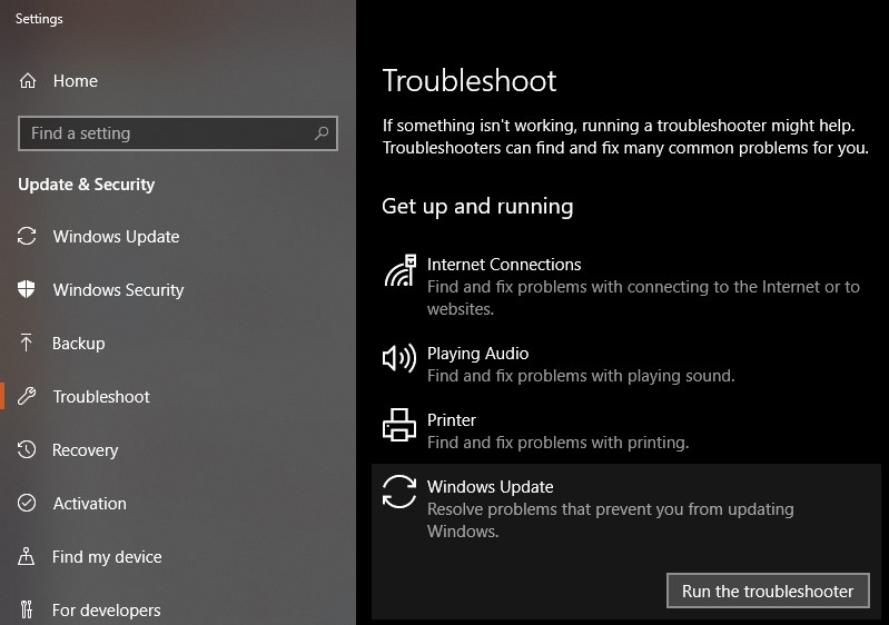 • 在菜单中,导航到Windows Update,然后单击“运行疑难解答”。