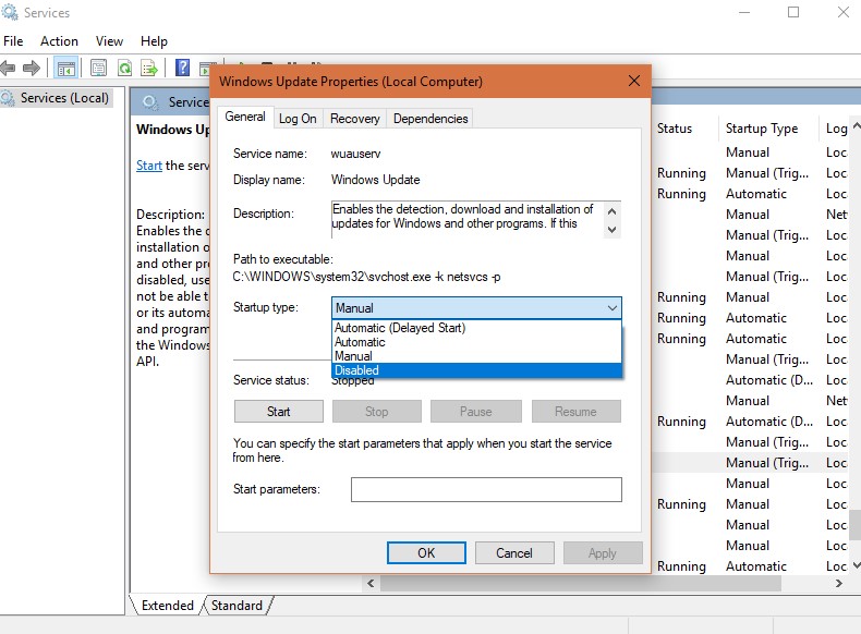 • Startup type设置为Disabled,然后选择OK。