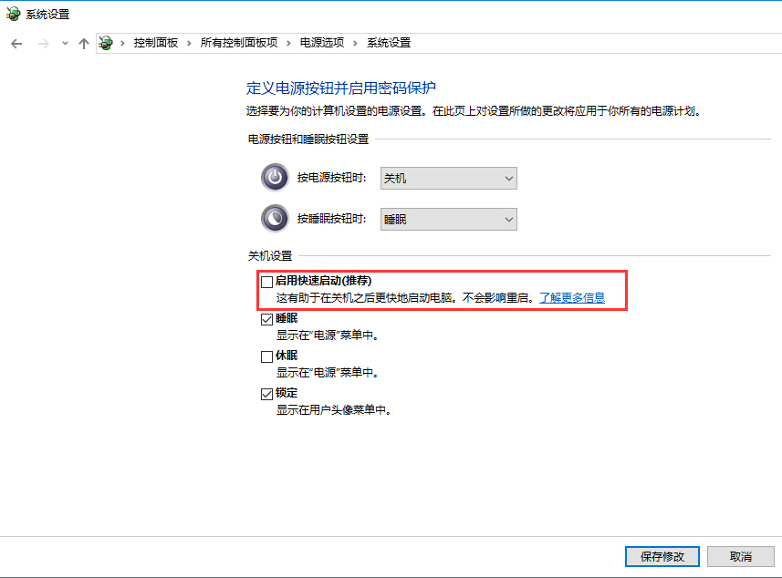 • 然后取消选中“启用快速启动(推荐)”选项,然后单击“保存更改”