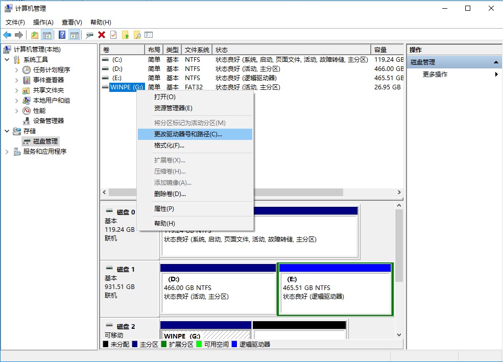 • 在“磁盘管理”窗口中找到USB硬盘驱动器,右键单击驱动器,然后选择“更改驱动器号和路径”